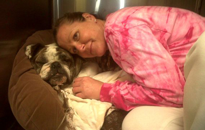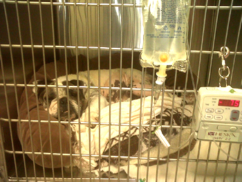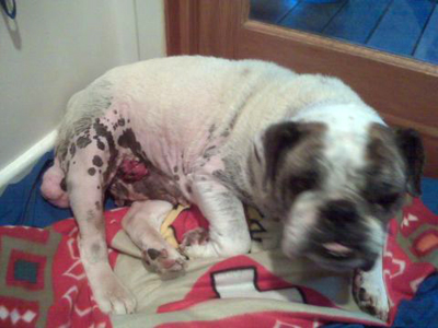 Poor Avery was rescued just in time from a HORRENDOUS situation in a puppy mill. She is an English bulldog who was overbred until her ovary swelled up to the size of an orange (it should have been the size of a grape!). We can't even imagine the kind of pain she must have been in. Because of neglect, she also has spindle tumors all over. She was sick and malnourished and because of being in such bad shape, ended up needing a blood transfusion after her surgery and had to stay at the vet for three days. Please help cover the cost of helping this brave lady!!! Please visit our donations page to help! And please pass her story on to people who think it's okay to buy puppies from stores! Avery, recovering from surgery